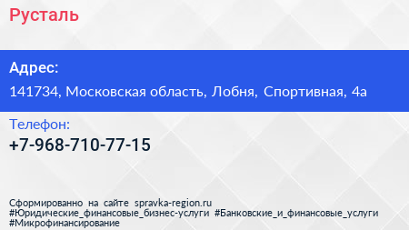 Русталь по адресу 141734, Московская область, Лобня, Спортивная, 4а в дальнейшем Организация, размещена в следующих категориях:
