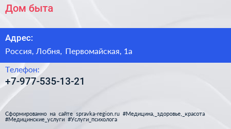 Для связи с организацией воспользуйтесь номером телефона: +7-977-535-13-21. Пн: выходной, Вт: c 09:00-20:00, Ср: c 09:00-20:00, Чт: c 09:00-20:00, Пт: c 09:00-20:00, Сб: c 09:00-20:00, Вс: c 09:00-18:00, вы можете обратиться в эту организацию.
