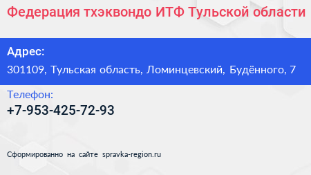 Федерация тхэквондо (ИТФ) Тульской области по адресу 301109, Тульская область, Ломинцевский, Будённого, 7 в дальнейшем Организация, размещена в следующих категориях:
