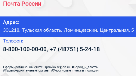 Почта России по адресу 301218, Тульская область, Ломинцевский, Центральная, 5 в дальнейшем Организация, размещена в следующих категориях: