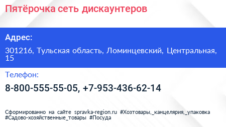 Пятёрочка, сеть дискаунтеров по адресу 301216, Тульская область, Ломинцевский, Центральная, 15 в дальнейшем Организация, размещена в следующих категориях: