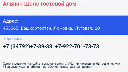 Альпин Шале, гостевой дом по адресу 453565, Башкортостан, Ломовка, Луговая, 10 в дальнейшем Организация, размещена в следующих категориях:
