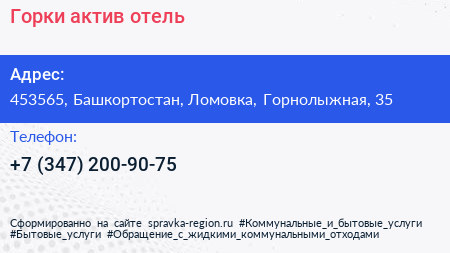 Горки, актив-отель по адресу 453565, Башкортостан, Ломовка, Горнолыжная, 35 в дальнейшем Организация, размещена в следующих категориях: