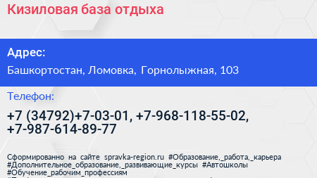 Кизиловая, база отдыха по адресу Башкортостан, Ломовка, Горнолыжная, 103 в дальнейшем Организация, размещена в следующих категориях: