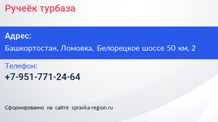Ручеёк, турбаза по адресу Башкортостан, Ломовка, Белорецкое шоссе 50 км, 2 в дальнейшем Организация, размещена в следующих категориях: