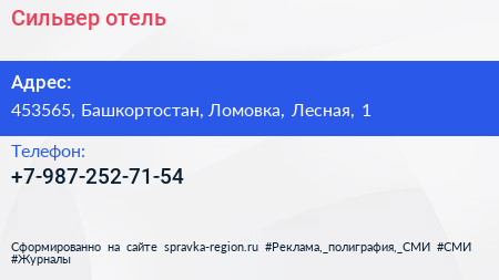 Сильвер, отель по адресу 453565, Башкортостан, Ломовка, Лесная, 1 в дальнейшем Организация, размещена в следующих категориях: