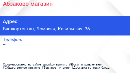 Абзаково, магазин по адресу Башкортостан, Ломовка, Кизильская, 36 в дальнейшем Организация, размещена в следующих категориях: