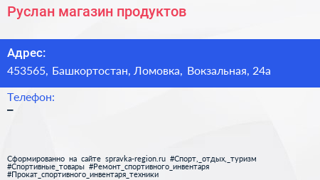 Руслан, магазин продуктов по адресу 453565, Башкортостан, Ломовка, Вокзальная, 24а в дальнейшем Организация, размещена в следующих категориях: