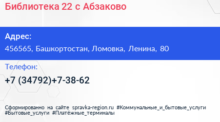 Библиотека №22, с. Абзаково по адресу 456565, Башкортостан, Ломовка, Ленина, 80 в дальнейшем Организация, размещена в следующих категориях: