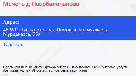 Мечеть, д. Новобалапаново по адресу 453611, Башкортостан, Ломовка, Ишмухамета Мурдакаева, 55а в дальнейшем Организация, размещена в следующих категориях: