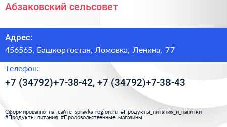 Абзаковский сельсовет по адресу 456565, Башкортостан, Ломовка, Ленина, 77 в дальнейшем Организация, размещена в следующих категориях: