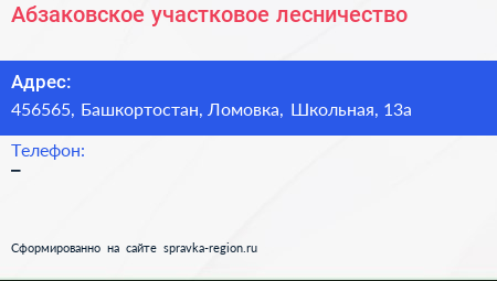 Абзаковское участковое лесничество по адресу 456565, Башкортостан, Ломовка, Школьная, 13а в дальнейшем Организация, размещена в следующих категориях: