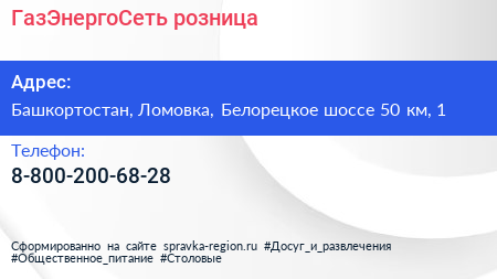 ГазЭнергоСеть розница по адресу Башкортостан, Ломовка, Белорецкое шоссе 50 км, 1 в дальнейшем Организация, размещена в следующих категориях: