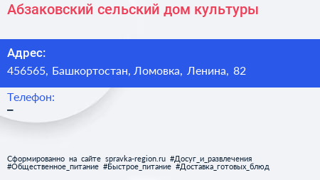 Абзаковский сельский дом культуры по адресу 456565, Башкортостан, Ломовка, Ленина, 82 в дальнейшем Организация, размещена в следующих категориях: