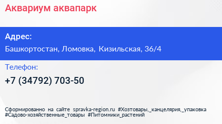 Аквариум, аквапарк по адресу Башкортостан, Ломовка, Кизильская, 36/4 в дальнейшем Организация, размещена в следующих категориях: