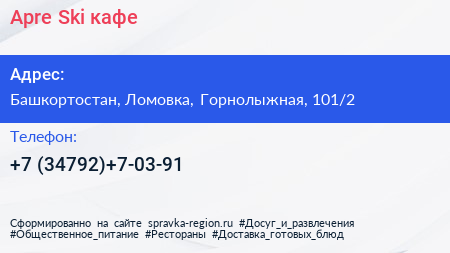 Apre Ski, кафе по адресу Башкортостан, Ломовка, Горнолыжная, 101/2 в дальнейшем Организация, размещена в следующих категориях: