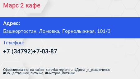 Марс-2, кафе по адресу Башкортостан, Ломовка, Горнолыжная, 101/3 в дальнейшем Организация, размещена в следующих категориях: