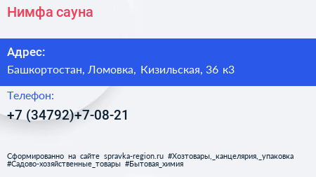 Нимфа, сауна по адресу Башкортостан, Ломовка, Кизильская, 36 к3 в дальнейшем Организация, размещена в следующих категориях: