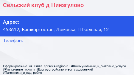 Сельский клуб, д. Ниязгулово по адресу 453612, Башкортостан, Ломовка, Школьная, 12 в дальнейшем Организация, размещена в следующих категориях: