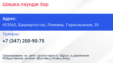 Шишка, лаундж-бар по адресу 453565, Башкортостан, Ломовка, Горнолыжная, 35 в дальнейшем Организация, размещена в следующих категориях: