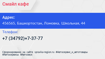 Смайл, кафе по адресу 456565, Башкортостан, Ломовка, Школьная, 44 в дальнейшем Организация, размещена в следующих категориях: