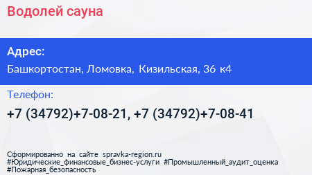 Водолей, сауна по адресу Башкортостан, Ломовка, Кизильская, 36 к4 в дальнейшем Организация, размещена в следующих категориях: