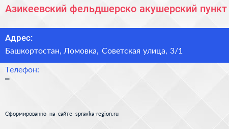 Азикеевский фельдшерско-акушерский пункт по адресу Башкортостан, Ломовка, Советская улица, 3/1 в дальнейшем Организация, размещена в следующих категориях: