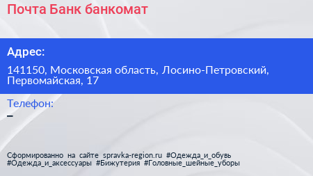 Почта Банк, банкомат по адресу 141150, Московская область, Лосино-Петровский, Первомайская, 17 в дальнейшем Организация, размещена в следующих категориях: