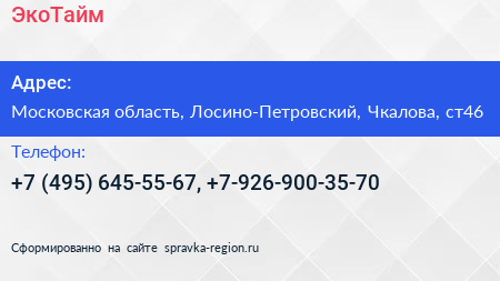 ЭкоТайм по адресу Московская область, Лосино-Петровский, Чкалова, ст46 в дальнейшем Организация, размещена в следующих категориях: