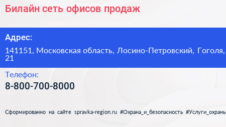 Билайн, сеть офисов продаж по адресу 141151, Московская область, Лосино-Петровский, Гоголя, 21 в дальнейшем Организация, размещена в следующих категориях: