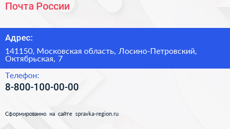 Почта России по адресу 141150, Московская область, Лосино-Петровский, Октябрьская, 7 в дальнейшем Организация, размещена в следующих категориях: