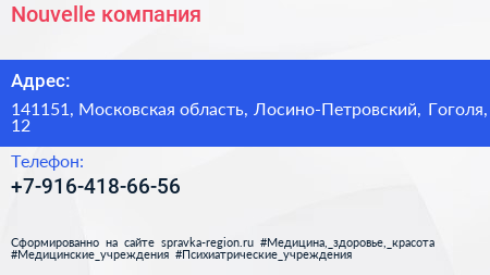 Nouvelle, компания по адресу 141151, Московская область, Лосино-Петровский, Гоголя, 12 в дальнейшем Организация, размещена в следующих категориях: