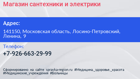 Магазин сантехники и электрики по адресу 141150, Московская область, Лосино-Петровский, Ленина, 9 в дальнейшем Организация, размещена в следующих категориях: