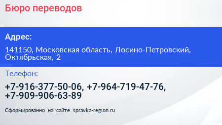 Бюро переводов по адресу 141150, Московская область, Лосино-Петровский, Октябрьская, 2 в дальнейшем Организация, размещена в следующих категориях: