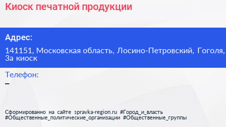 Киоск печатной продукции по адресу 141151, Московская область, Лосино-Петровский, Гоголя, 3а киоск в дальнейшем Организация, размещена в следующих категориях: