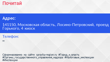 Почитай по адресу 141150, Московская область, Лосино-Петровский, проезд Горького, 4 киоск в дальнейшем Организация, размещена в следующих категориях: