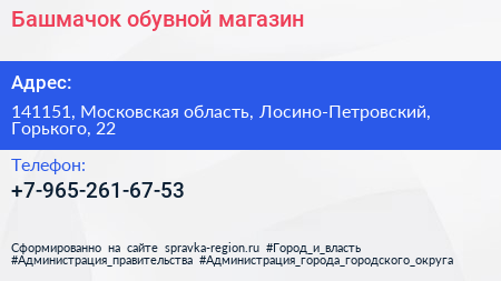 Башмачок, обувной магазин по адресу 141151, Московская область, Лосино-Петровский, Горького, 22 в дальнейшем Организация, размещена в следующих категориях: