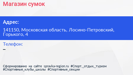 Магазин сумок по адресу 141150, Московская область, Лосино-Петровский, Горького, 4 в дальнейшем Организация, размещена в следующих категориях:
