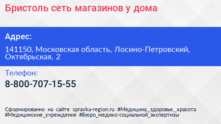 Бристоль, сеть магазинов у дома по адресу 141150, Московская область, Лосино-Петровский, Октябрьская, 2 в дальнейшем Организация, размещена в следующих категориях: