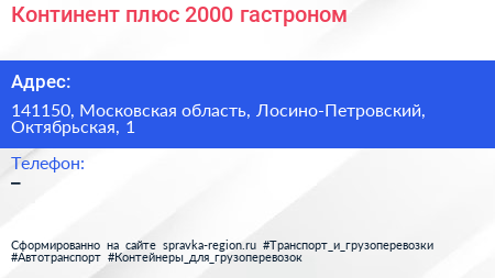 Континент плюс 2000, гастроном по адресу 141150, Московская область, Лосино-Петровский, Октябрьская, 1 в дальнейшем Организация, размещена в следующих категориях: