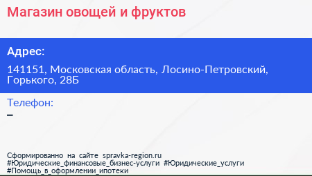 Магазин овощей и фруктов по адресу 141151, Московская область, Лосино-Петровский, Горького, 28Б в дальнейшем Организация, размещена в следующих категориях: