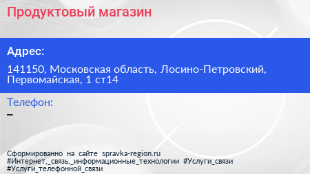 Продуктовый магазин по адресу 141150, Московская область, Лосино-Петровский, Первомайская, 1 ст14 в дальнейшем Организация, размещена в следующих категориях: