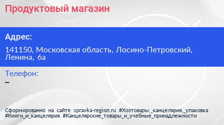 Продуктовый магазин по адресу 141150, Московская область, Лосино-Петровский, Ленина, 6а в дальнейшем Организация, размещена в следующих категориях:
