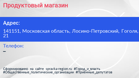 Продуктовый магазин по адресу 141151, Московская область, Лосино-Петровский, Гоголя, 21 в дальнейшем Организация, размещена в следующих категориях: