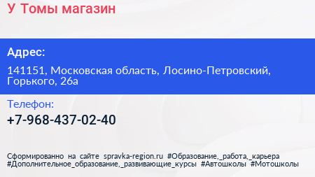 У-Томы, магазин по адресу 141151, Московская область, Лосино-Петровский, Горького, 26а в дальнейшем Организация, размещена в следующих категориях: