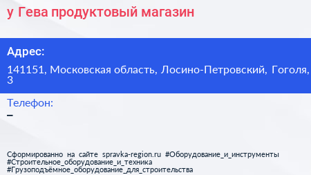 у Гева, продуктовый магазин по адресу 141151, Московская область, Лосино-Петровский, Гоголя, 3 в дальнейшем Организация, размещена в следующих категориях: