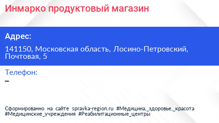 Инмарко, продуктовый магазин по адресу 141150, Московская область, Лосино-Петровский, Почтовая, 5 в дальнейшем Организация, размещена в следующих категориях: