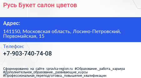 Русь Букет, салон цветов по адресу 141150, Московская область, Лосино-Петровский, Первомайская, 15 в дальнейшем Организация, размещена в следующих категориях: