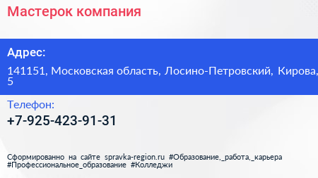 Для связи с организацией воспользуйтесь номером телефона: +7-925-423-91-31. Ежедневно с 09:00 до 20:00, вы можете обратиться в эту организацию.