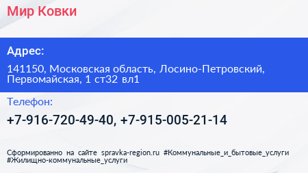 Мир Ковки по адресу 141150, Московская область, Лосино-Петровский, Первомайская, 1 ст32 вл1 в дальнейшем Организация, размещена в следующих категориях: